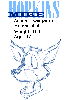Mike is the overachiever of the bunch. He believes in continually being busy and productive, and doesn't believe in "excesses" such as fatty foods or laziness. He delves into his academics (4.0 GPA, of course) and fills every other spare second with hobbies ranging from photography to singing to martial arts to sports. Most of the time he can be seen rollerblading on campus, doing several of the above at once. He disapproves of those who are "lazier" (which includes just about everyone) and takes it upon himself to guilt-trip everyone until they either "do the right thing" or "tell Mikey to go suck an egg" (and just about everyone prefers the latter). Mike clearly lacks a sense of fun in his life, especially in the women department--who has time to date with so much else to do? It's a pity, because most women find the fluffy, boyish kangaroo irresistible. If only he'd notice them.